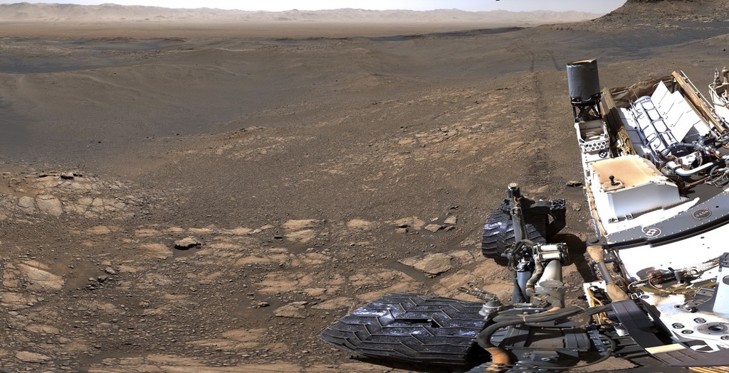 El panorama de 360º hecho por Curiosity, desplegado.No es el único panorama que ha tomado, con una segunda cámara también colocada en el mástil ha creado un panorama de menor resolución (unos 650 millones de píxeles) desde la cual se puede ver también la cubierta del rover y su brazo robótico.